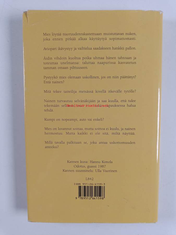 Erinomainen. Tarkempi kuntoluokka: K4- ; Pienoista kolhua selkämyksen yläreunassa. Kansipaperin kunto: joitain repeämiä/kulumaa
