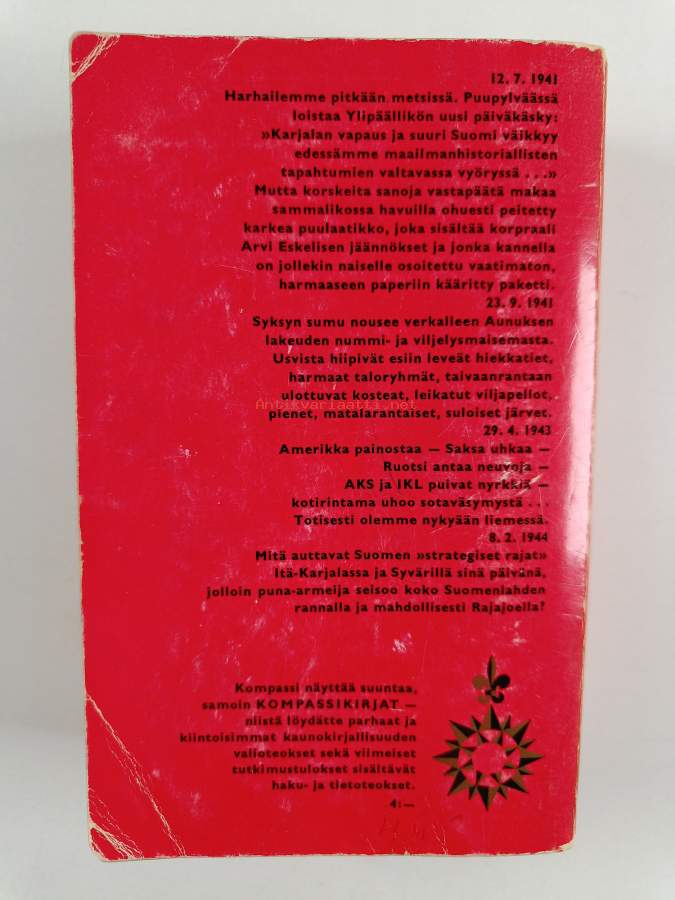 Tyydyttävä. Jonkin verran kulumaa, hieman taitejälkeä kansissa, pienoista repeämää selkämyksen kulmissa, jonkin verran läikkää, selkämyksessä hieman vinoutta, selkämyksessä lukutaittumaa
