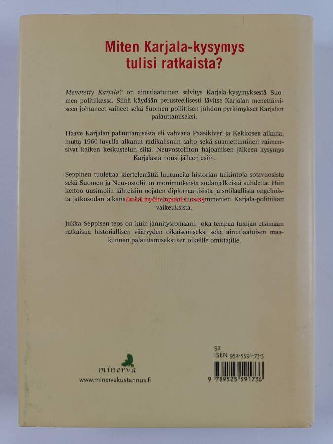 Menetetty Karjala? Karjala-kysymys Suomen politiikassa 1940-2000. Kirjassa käydään perusteellisesti läpi Karjalan menettämiseen johtaneet vaiheet ja pyrkimykset