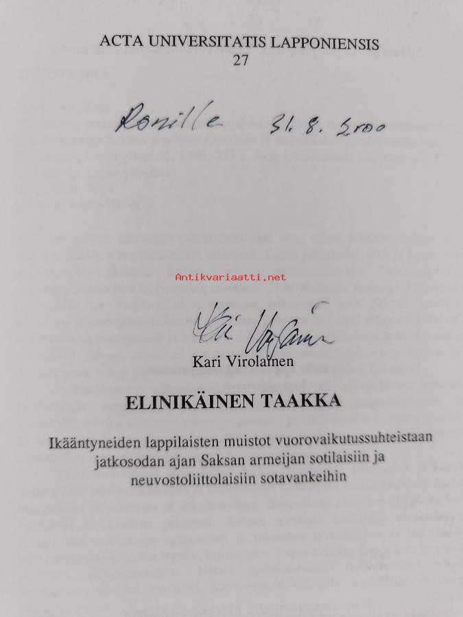 Koko nimi: Elinikäinen taakka : ikääntyneiden lappilaisten muistot vuorovaikutussuhteistaan jatkosodan ajan Saksan armeijan sotilaisiin ja neuvostoliittolaisiin sotavankeihin (signeerattu, tekijän omiste)Sarja: Acta Universitatis Lapponiensis 27Asiasanat: sota-aika, kokemukset, sota, muistot