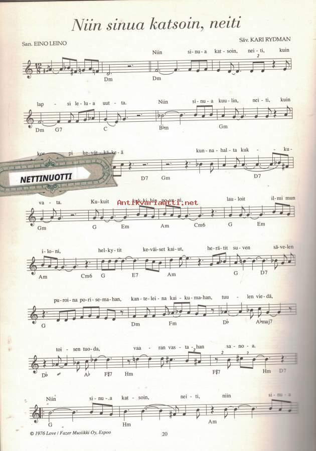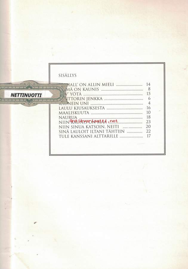 Sis: Alahall on allin mieli - Elämä on kaunis - Kaunein uni - Kanttorin jenkka - Maaliskuuta - Hyv' yötä - Niin kaunis on maa - Laulu kiusauksessa - Tule kanssani alttarille - Naurua - Sinä lauloit iltani tähtiin - Niin sinua katson, neiti.- Suuri Helposti kuori