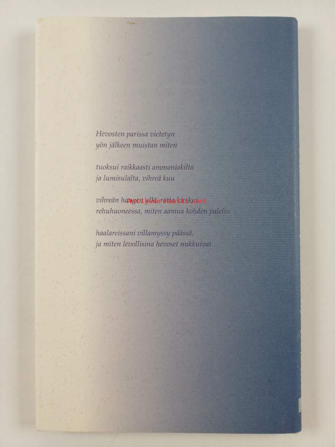 Hyvä. Tarkempi kuntoluokka: K3+ ; Pienoista kolhua kansissa, selkämyksessä aavistus vinoutta. Kansipaperin kunto: pientä kulumaa