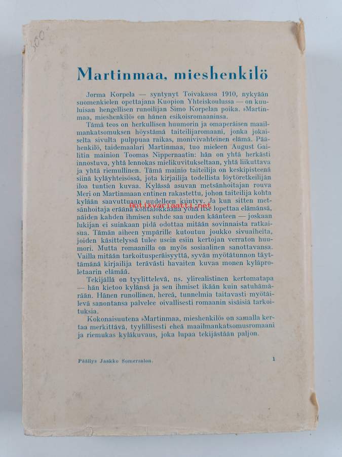 Hyvä. Hieman kulumaa reunoilla ja kulmissa, selkämyksessä vinoutta. Kansipaperin kunto: repeämiä/kulumaa