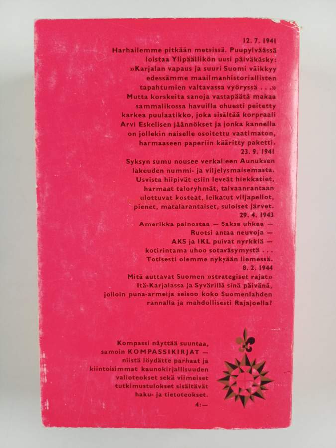 Tyydyttävä. Pientä kulumaa, pienoista rispaantumaa kansissa, selkämyksessä aavistus vinoutta, selkämyksessä lukutaittumaa, sivuilla lyijykynämerkintöjä