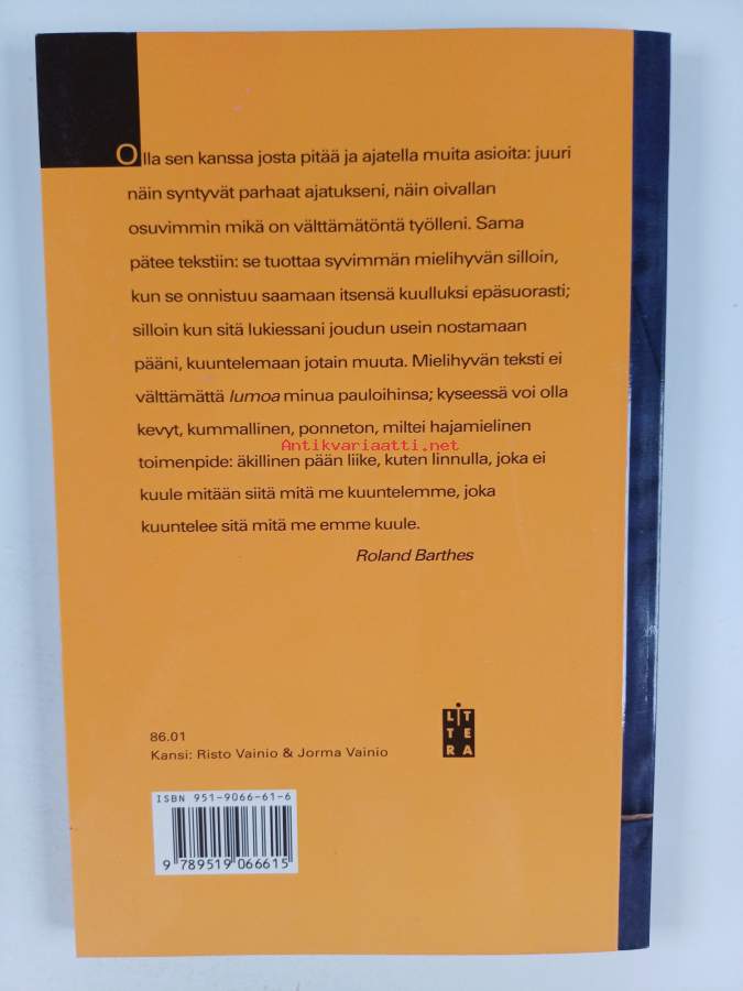 Muu(t) tekijä(t): Erkki Vainikkala, Raija SironenMerkinnät: omistajamerkintäSarja: LitteraAlkuteos: Le plaisir du texteAsiasanat: tekstit, lukeminen, mielihyvä