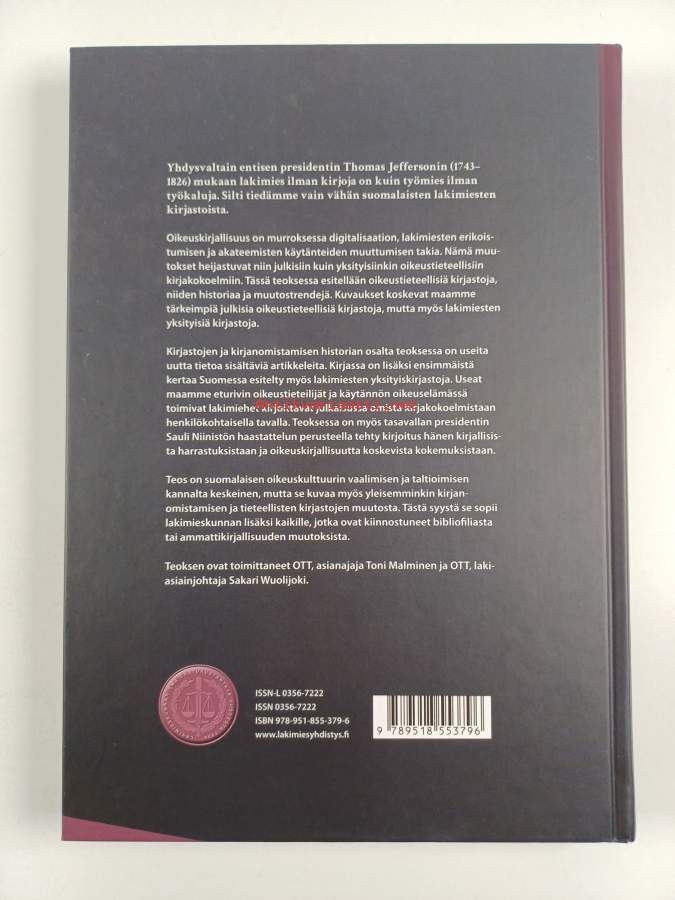 Muu(t) tekijä(t): Pekka Vihervuori, Mia Korpiola ym.Sarja: Suomalaisen lakimiesyhdistyksen julkaisuja C-sarja n:o 43Asiasanat: henkilöhistoria, juristit, kirjat, kokoelmat, kirjastot, oikeushistoria, oikeustiede, kirjastopalvelut, bibliofilia, yksityiskirjastot, tieteelliset kirjastot, korkeakoulukirjastot, oikeuskulttuuri, kirjastohistoria, erikoiskirjastot, ammattikirjallisuus