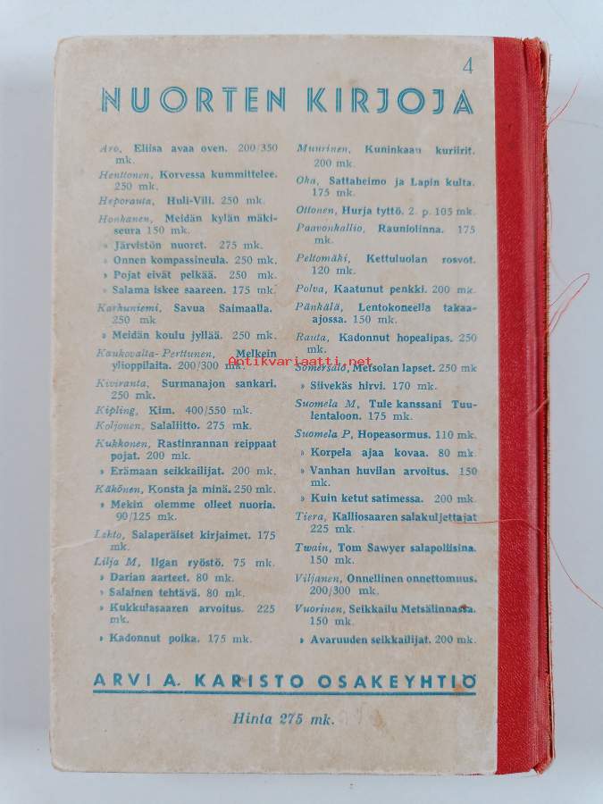 Tyydyttävä. Tarkempi kuntoluokka: K2- ; Pientä tahraisuutta, pientä repeämää selkämyksessä, hieman kulumaa reunoilla ja kulmissa, selkämyksessä hieman vinoutta