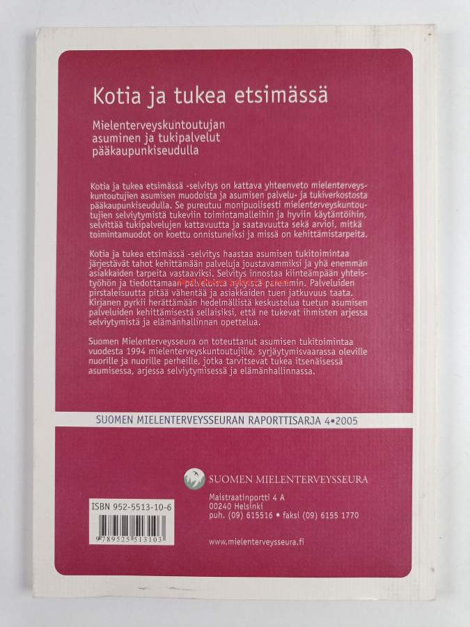 Sarja: Suomen mielenterveysseuran raporttisarja 4, 2005Asiasanat: tukihenkilöt, asuminen, mielenterveyshäiriöt, kuntoutus, psykiatrinen kuntoutus, psykiatriset potilaat, mielenterveyspalvelut, asumispalvelut, mielenterveyskuntoutujat, tukipalvelut, palveluasunnot, avopalvelut, tukiasunnot, pääkaupunkiseutu (Suomi)