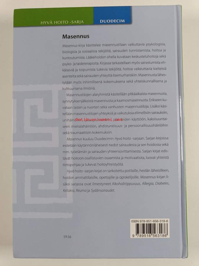 Muu(t) tekijä(t): Jyrki Tuulari, Tarja Heiskanen ym.Sarja: Hyvä hoito -sarjaAsiasanat: liikunta, hoitomenetelmät, hoito, itsehoito, työelämä, tunteet, itsemurha, lääkehoito, mielenterveyshäiriöt, jaksaminen, unihäiriöt, päihteet, psykoterapia, kuntoutus, persoonallisuushäiriöt, masennus, uupumus, kaksisuuntainen mielialahäiriö, ikääntyneet, työn kuormittavuus, synnytysmasennus, yleistynyt ahdistuneisuushäiriö, ikäryhmät, ahdistuneisuushäiriöt, vertaistuki, riskitekijät, traumaperäinen stressireaktio, uni (lepotila), Depressive Disorder, Depression, Social Support, kaamosmasennus, Comorbidity