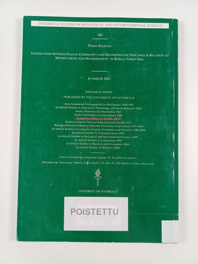 Interactions between faunal community and decomposition processes in relation to microclimate and heterogeneity in boreal forest soil (signeerattu, tekijän omiste)