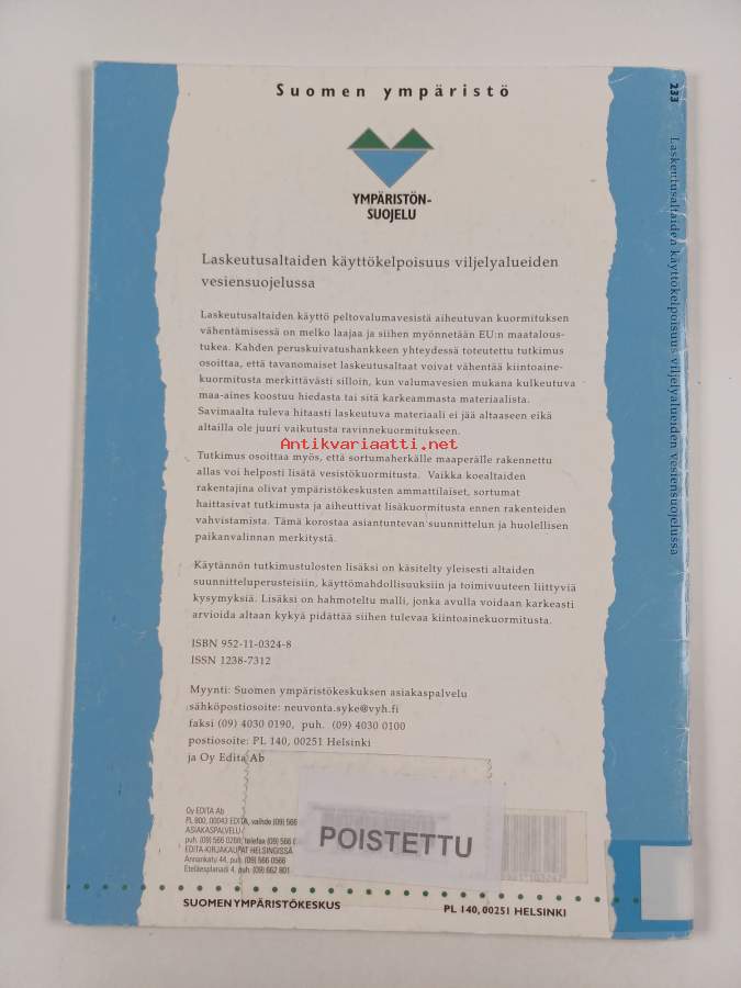 Muu(t) tekijä(t): Martti HäikiöSarja: Suomen ympäristö 233Asiasanat: viljely, ympäristönsuojelu, vesiensuojelu, pellot, vesistönkuormitus, kuivaus, ojitus, miljöskydd, vattenskydd, belastning av vattendrag, odling, torkning, valuma-alueet, tillrinningsområden, fosfori, typpi, åkrar, dikning, kväve, fosfor, valumavesi, lakvatten (avrinnande), kiintoaines, suspenderat material, laskeutusaltaat, sedimenteringsbassänger