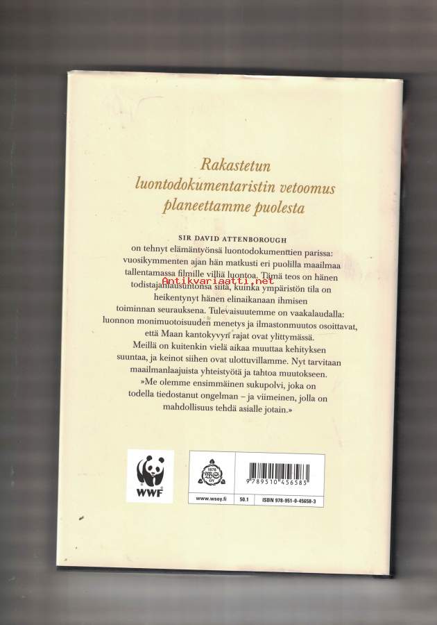 Alkuteos: A Life on Our Planet / Suomentanut Ilkka Rekiaro.Yksi elämä, yksi planeetta on aikamme tunnetuimman luonnontieteilijän Sir David Attenborough’n näkemys viisaamman tulevaisuuden turvaamiseksi, yhdessä luonnon kanssa.Asiasanat: luonto, luonnonhistoria, luonnonsuojelu, tulevaisuus, ilmastonmuutokset, ympäristö, visiot, Iso-Britannia, biodiversiteetti, luonnontieteilijät, kestävä elämäntapa- Postipaketti