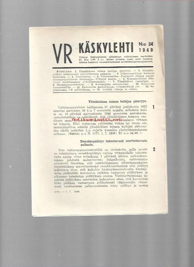 VR Käskylehti 1949 - Valtionrautatiet 6 kpl erä