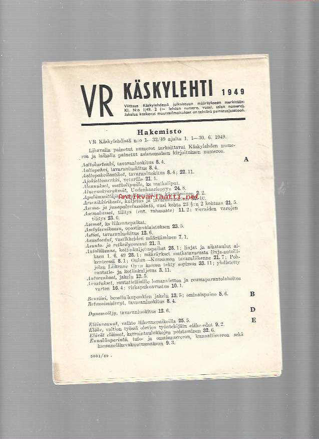 VR Käskylehti 1949 hakemisto - Valtionrautatiet