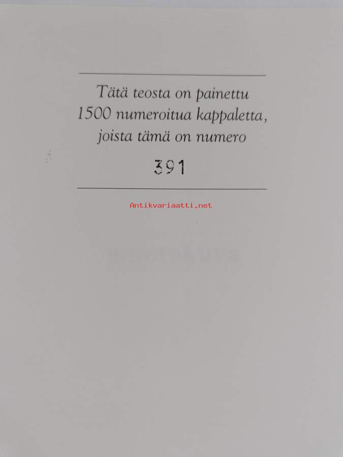 Erinomainen. Tarkempi kuntoluokka: K4- ; Pienoista kolhua etukannen alareunassa. numero 391/1500