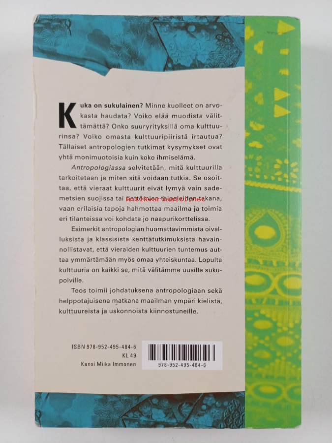 Muu(t) tekijä(t): Timo Kallinen, Matti Eräsaari ym.Alkuteos: AnthropologyAsiasanat: oppihistoria, poliittiset järjestelmät, kulttuuri, vertaileva tutkimus, tutkimushistoria, kulttuuriantropologia, symbolit, imperialismi, kulttuurierot, sukulaisuus, tutkimusmenetelmät, metodologia, kulttuurintutkimus, biologinen antropologia, sosiaaliantropologia, antropologia, sosialisaatio, symbolismi, etnografia, vertaileva kielitiede, koulukunnat, kriittisyys, antropologit, lääketieteellinen antropologia, lingvistinen antropologia, sosiaaliset normit, psykologinen antropologia, kenttätyö, kenttätyömenetelmät, poliittinen antropologia, käsitteenmuodostus, kulttuurirelativismi