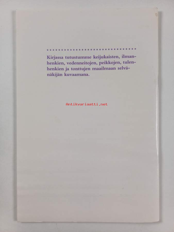 Muu(t) tekijä(t): Väinö ValvanneAsiasanat: tonttu, peikko, vedenneito, keijukainen, ilmanhenki, tulenhenki, selvänäkijä