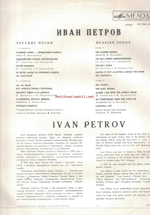 Bass Vocals – Ivan PetrovConductor – V. GnutovOrchestra – Ossipov Russian Folk OrchestraA 1. The Sacred Baikal 2. The Bell Rings Monotonously 3.Driver's Song 4. Masha Is Not Allowed Across The River 5. Oh, NastasyaB 1. Oh, Vanya 2.The Mail Troika 3. Alone I Go Into The Lonely Road 4. My Sweetheart Does Not Love Me 5. Farewell, JoyTodennäköisesti soittamaton levy.- Postipaketti