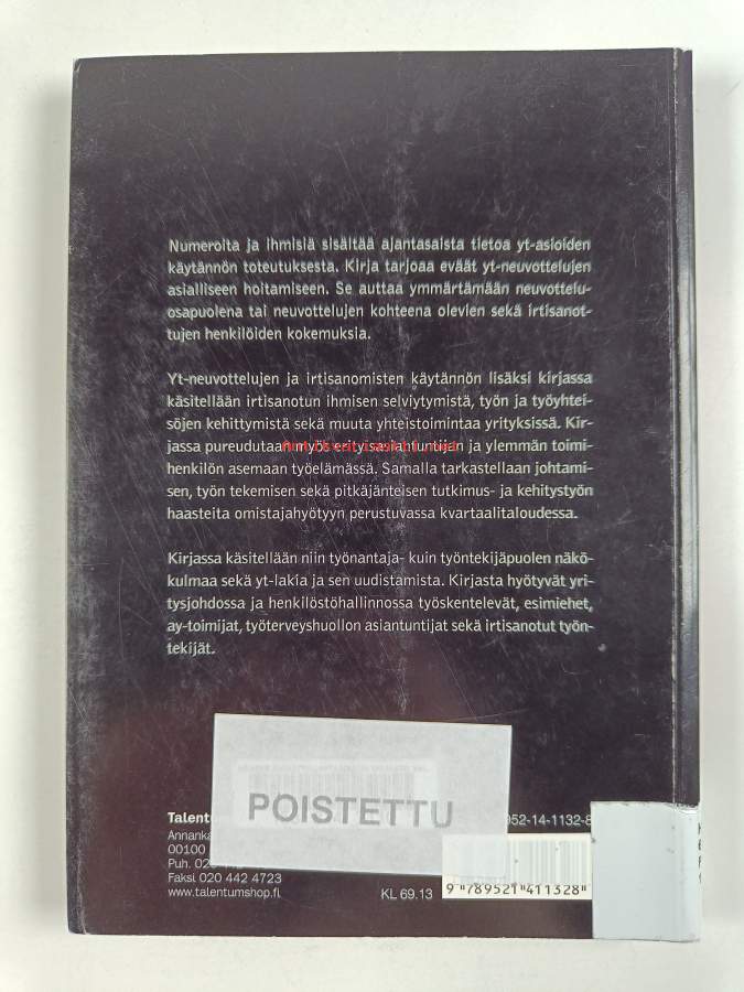 Muu(t) tekijä(t): Satu RoosAsiasanat: vaikutukset, yritykset, lainsäädäntö, johtaminen, johtajuus, työelämä, tunteet, työyhteisöt, tulevaisuus, selviytyminen, työpaikat, henkilöstöjohtaminen, toiminta, työ, osaaminen, työsuhde, henkilöstöpolitiikka, henkilöstö, kehitys, yhteistoiminta, työelämän suhteet, työntekijät, työnantajat, irtisanominen, lait, ammattietiikka, organisaatiokulttuuri, hiljainen tieto, yhteistoimintamenettely, työpaikkakulttuuri, tutkimus- ja kehittämistoiminta, neuvottelut