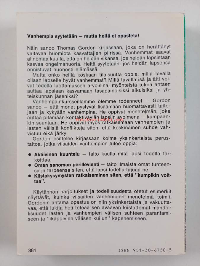 Muu(t) tekijä(t): Pirkko Talvio-JaatinenAlkuteos: P.E.T. parent effectiveness trainingAsiasanat: vanhempi-lapsisuhde, lapset, vanhemmuus, perhe, vanhemmat, perhe-elämä, kotikasvatus, kasvatus, kasvatusoppaat, vanhempainkasvatus