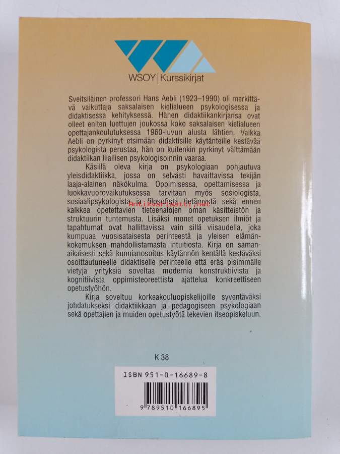Muu(t) tekijä(t): Unto SinkkonenMerkinnät: ylivedetty omistajamerkintäSarja: WSOY kurssikirjatAlkuteos: Zwölf Grundformen des LehrensAsiasanat: didaktiikka, oppimisprosessi, oppimispsykologia