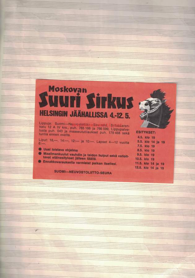 Moskovan suuri SIRKUS Messuhallissa -ohjelma esite. Suomen ensimmäinen vierailu 1960