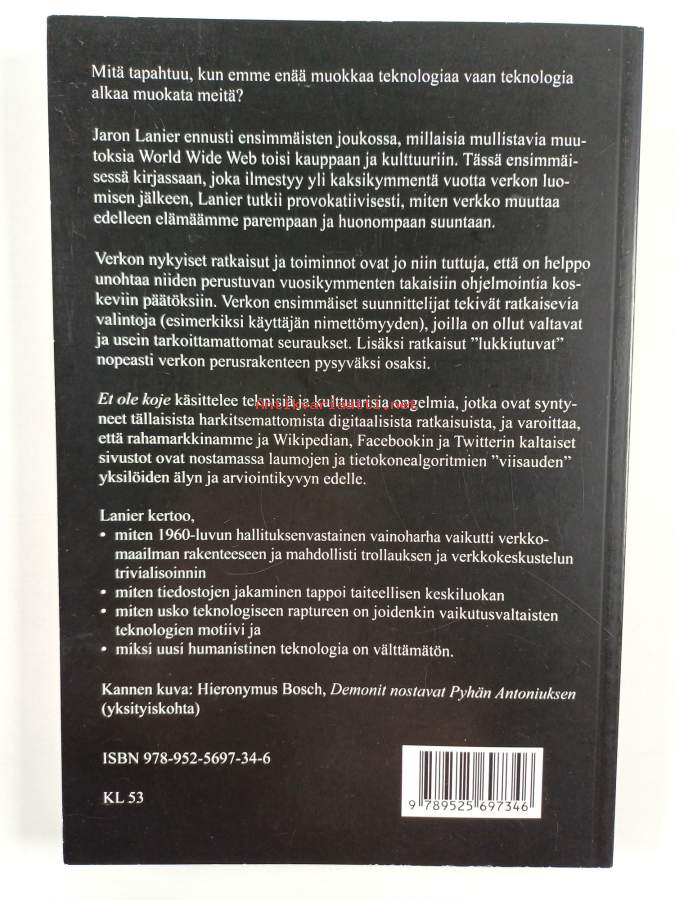 Alkuteos: You are not a gadgetAsiasanat: tietotekniikka, tietoverkot, teknologinen kehitys, digitaalinen kulttuuri