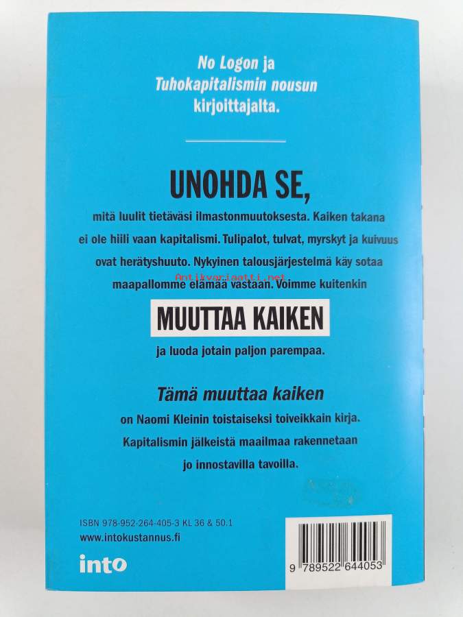 Muu(t) tekijä(t): Teppo Eskelinen, Kaj Lipponen ym.Alkuteos: This changes everythingAsiasanat: talouspolitiikka, kansainväliset sopimukset, ympäristöpolitiikka, tulevaisuudentutkimus, ympäristön tila, luonnonvarat, ilmastonmuutokset, etiikka, kapitalismi, ympäristövaikutukset, ilmastopolitiikka, ympäristöaktivismi