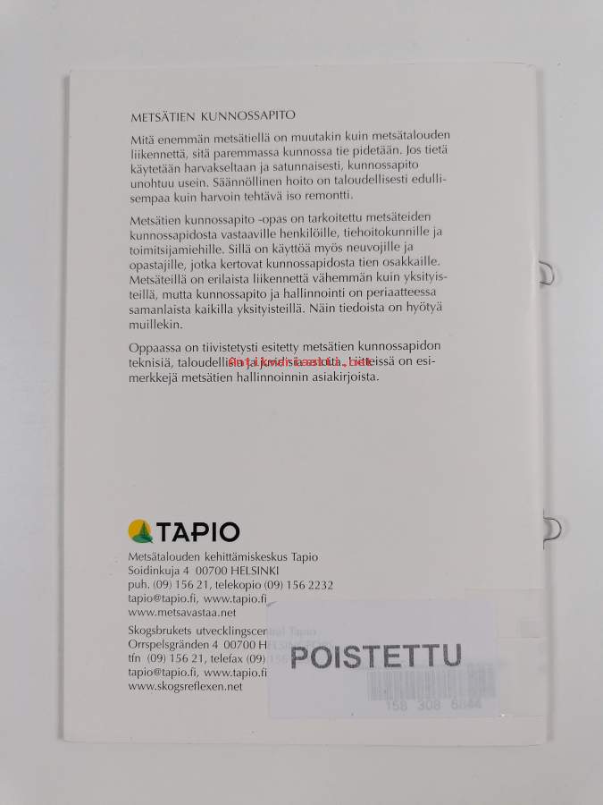 Muu(t) tekijä(t): Juhani KokkonenAsiasanat: kunnossapito, underhåll (skötsel), metsätiet, skogsvägar