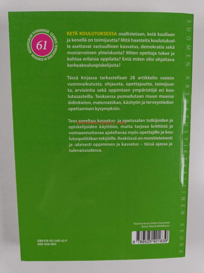 Muu(t) tekijä(t): Päivi AtjonenSarja: Kasvatusalan tutkimuksia 61Asiasanat: koulutus, tarinat, arvot, kielioppi, ongelmalapset, erityisopetus, vanhemmat, yhteistyö, koulu, kerronta, opettajat, kasvatus, oppiminen, lukihäiriöt, matematiikka, opetusmenetelmät, opintomenestys, koulut, pedagogiikka, mielipiteet, ympäristö, moraali, seksuaalikasvatus, lukutaito, poikkeava käyttäytyminen, ammattikorkeakoulut, kansalaisjärjestöt, korkeakouluopiskelu, äidinkieli, opinnäytteet, päiväkodit, kouluympäristö, eettinen kasvatus, ympäristötietoisuus, yläkoulu, käsityö, kasvatusfilosofia, yhteiskunnalliset liikkeet, mielihyvä, opettajankoulutus, piirustukset, opettajuus, lastentarhanopettajat, kansalaiskasvatus, oppiaineet, luokanopettajat, opetustoimi, kädentaidot, opiskelumotivaatio, riidat, oppilaanohjaus, opetushallinto, arvottaminen, opintojen keskeyttäminen, opintojen kesto, Freire-pedagogiikka, tutorointi, ryhmäohjaus, terveystieto, luokkatyöskentely, toimijuus, koulutusvalinnat, tutkiva opettaja, tukiopetus, metsäneuvonta