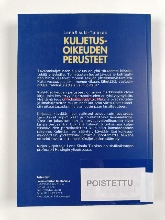 Muu(t) tekijä(t): Mikko TulokasAlkuteos: Transporträttens grunderAsiasanat: matkailu, merikuljetus, kuljetusoikeus, rautatiekuljetus, ilmakuljetus, tiekuljetus, rahti, huolinta, konossementti