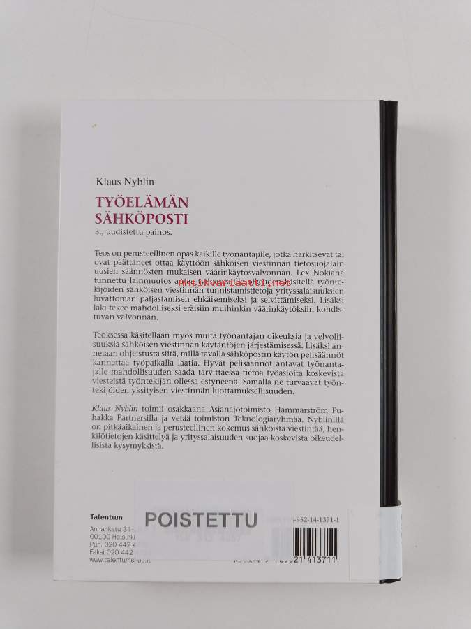 Asiasanat: lainsäädäntö, käyttö, työelämä, sähköinen viestintä, viestintä, sähköposti, organisaatiot, oikeudet, tietoturva, tietosuoja, työntekijät, työnantajat, valvonta, yhteisöviestintä, yksityisyys, yksilönsuoja, kirjesalaisuus, sähköisen viestinnän tietosuojalaki, laki yksityisyyden suojasta työelämässä