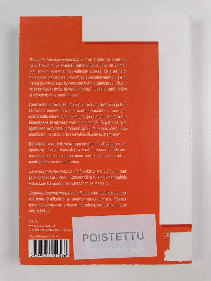 Muu(t) tekijä(t): Juhani Aaltola, Juha T. Hakala ym.Sarja: Ikkunoita tutkimusmetodeihin 1; virikkeitä aloittelevalle tutkijalleAsiasanat: ongelmanratkaisu, havainnointi, elämäkertatutkimus, kasvatustiede, tutkimusmenetelmät, tutkimustyö, yhteiskuntatieteet, tutkimusaineisto, toimintatutkimus, metodologia, haastattelututkimus, miellekartat, menetelmät, tapaustutkimus, valinta, tutkielmat, teemahaastattelut, sosiometria, kyselytutkimus, eläytymismenetelmä, survey-tutkimus
