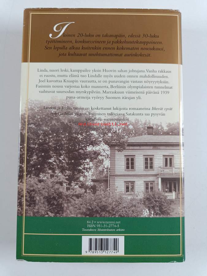 Hyvä. Pienoista kolhua selkämyksen päissä, pienoista kulumaa kansissa, selkämyksessä hieman vinoutta. Kansipaperin kunto: jonkin verran kulumaa/pienoisia repeämiä