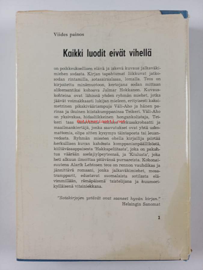 Hyvä. Hieman kulumaa, hieman nuhruisuutta kansissa, selkämyksessä hieman vinoutta. Kansipaperin kunto: jonkin verran kulumaa/pienoisia repeämiä