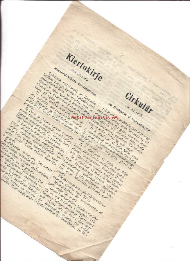 Kiertokirje Kaikille konduktööreille nr 22 / 1389 1918¨ makasiinien vuokrista