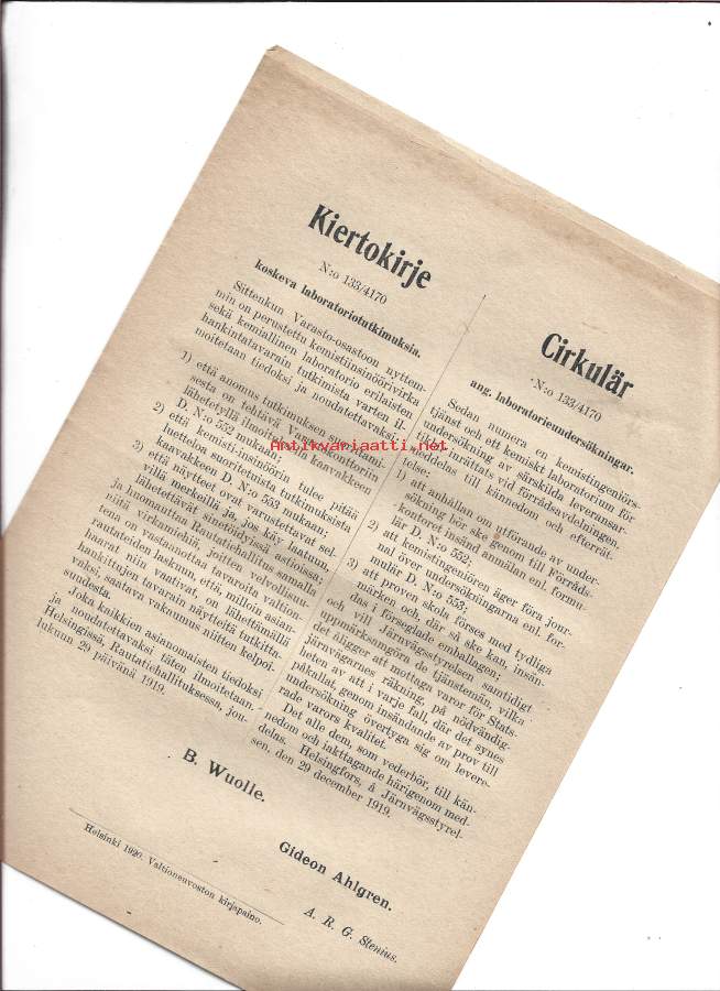 Kiertokirje nr 133 / 4170 1919laboratoriotutkimukset - kemisti-insinööri