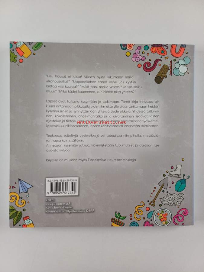 Asiasanat: luonto, eläimet, kasvit, leikit, avaruus, tekniikka, fysiikka, luonnontieteet, fysikaaliset ilmiöt, maaperä, tiede, päivähoito, varhaiskasvatus, esiopetus, vesi, oppimateriaali, luonto-opetus, ilmiöt, harjoitukset, tutkiva oppiminen, ilma, lapset (ikäryhmät), tiedekasvatus