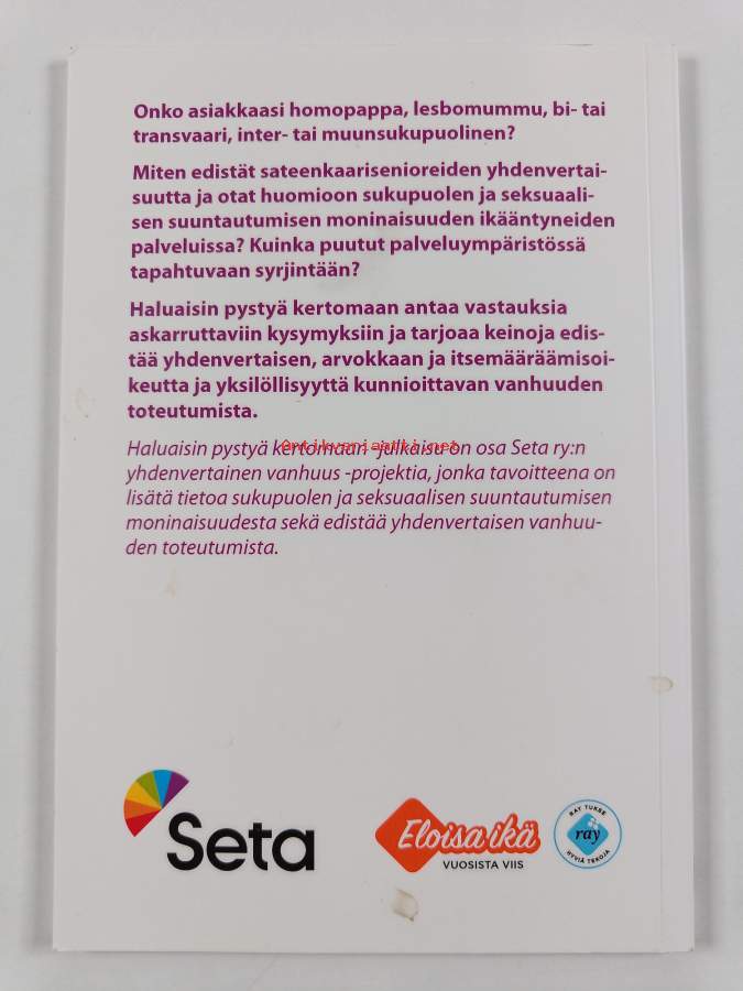 Muu(t) tekijä(t): Salla-Maija HakolaSarja: Seta-julkaisuja 26Asiasanat: palvelut, vanhukset, ikääntyneet, yhdenvertaisuus, sukupuolivähemmistöt, seksuaalivähemmistöt, vanhuspalvelut