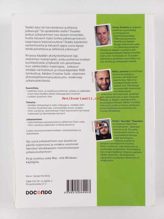 Muu(t) tekijä(t): Petteri Paananen, Miika Lammela ym.Asiasanat: tietotekniikka, suunnittelu, digitaalitekniikka, atk-ohjelmat, kuvankäsittely, visuaalinen viestintä, julkaisun laadinnan oppaat, painotuotteet, graafinen suunnittelu, tietokonegrafiikka, Photoshop, Adobe Illustrator, typografia, verkkojulkaisut, julkaisutoiminta, taitto, desktop publishing, Acrobat, Adobe InDesign, sähköiset julkaisut, verkkojulkaiseminen, sähköinen julkaisutoiminta, julkaisut, datorgrafik, bildbehandling, julkaisujärjestelmät, Adobe Creative Suite, Illustrator, InDesign, sidombrytningsprogram