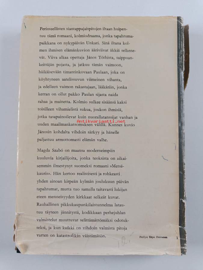 Hyvä. Tarkempi kuntoluokka: K3+ ; Hieman kulumaa, selkämyksessä hieman vinoutta. Kansipaperin kunto: repeämiä/kulumaa
