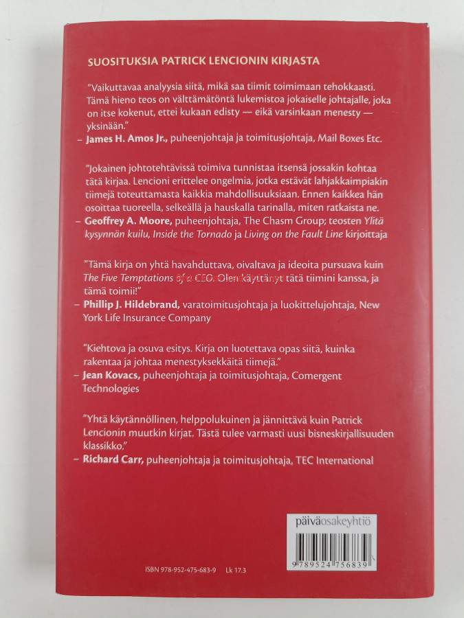 Muu(t) tekijä(t): Marja SevonAlkuteos: The five dysfunctions of a teamAsiasanat: johtaminen, johtajuus, ryhmätyö, häiriöt, organisaatiot, ryhmät, tiimityö, ryhmädynamiikka, tiimit, organisointi, toimintahäiriöt