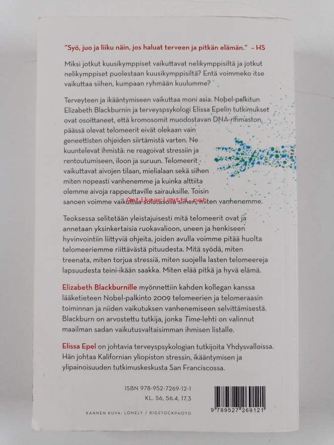 Muu(t) tekijä(t): Teija Hartikainen, Elissa EpelAlkuteos: The telomere effectAsiasanat: terveyskäyttäytyminen, elintavat, ikääntyminen, ikä, DNA, solut, pitkäikäisyys, elinvoimaisuus, kromosomit, telomeerit