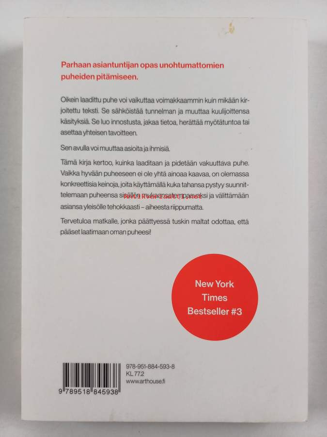 Muu(t) tekijä(t): Veli-Pekka (suom.) KetolaAlkuteos: Ted talks : The Official TED Guide to Public SpeakingAsiasanat: puhetaito, puheet, puheviestintä, suullinen ilmaisu