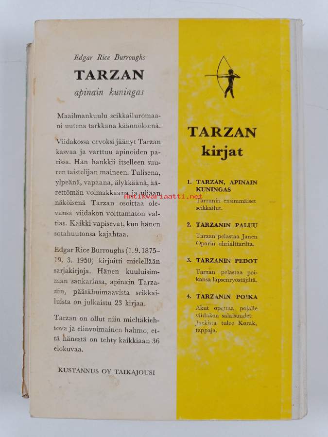 Muu(t) tekijä(t): Seppo Ilmari, J. Allen St. JohnMerkinnät: omistajamerkintäSarja: Tarzan-kirjat 1Alkuteos: Tarzan of the apesAsiasanat: seikkailukirjat