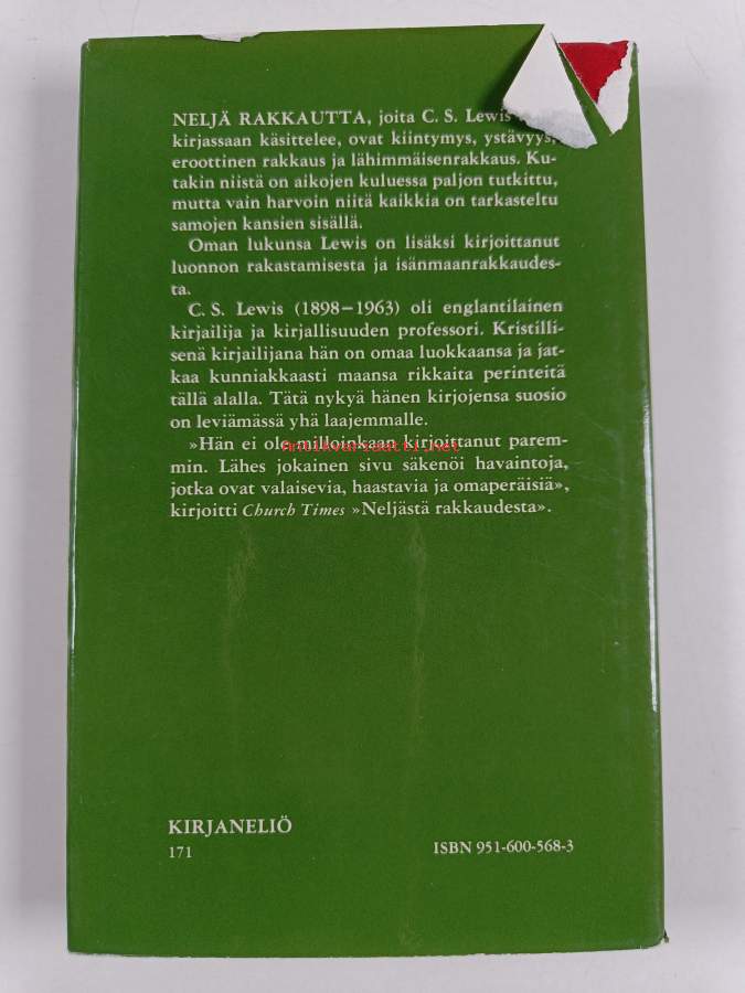 Hyvä. Hieman kolhua kansissa, selkämyksessä aavistus vinoutta. Kansipaperin kunto: joitain repeämiä/kulumaa