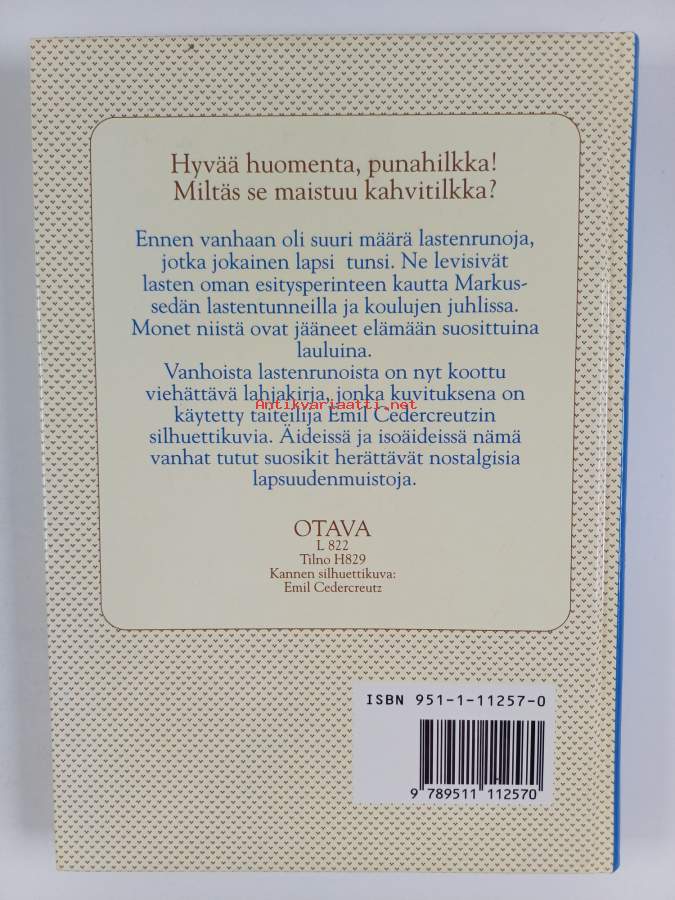 Muu(t) tekijä(t): Ismo Loivamaa, Emil CedercreutzAsiasanat: kuvitus, lastenkirjallisuus, runot, lastenperinne, lorut, lastenrunot