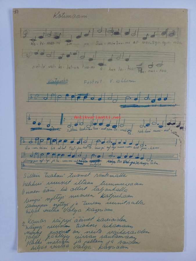 Tyydyttävä. Tarkempi kuntoluokka: K2- ; Hieman tahraisuutta, pientä kulumaa, hieman taitejälkeä kansissa, sivuilla merkintöjä. 2. vihkossa hieman läikkää, muutama vihko hieman parempikuntoisia