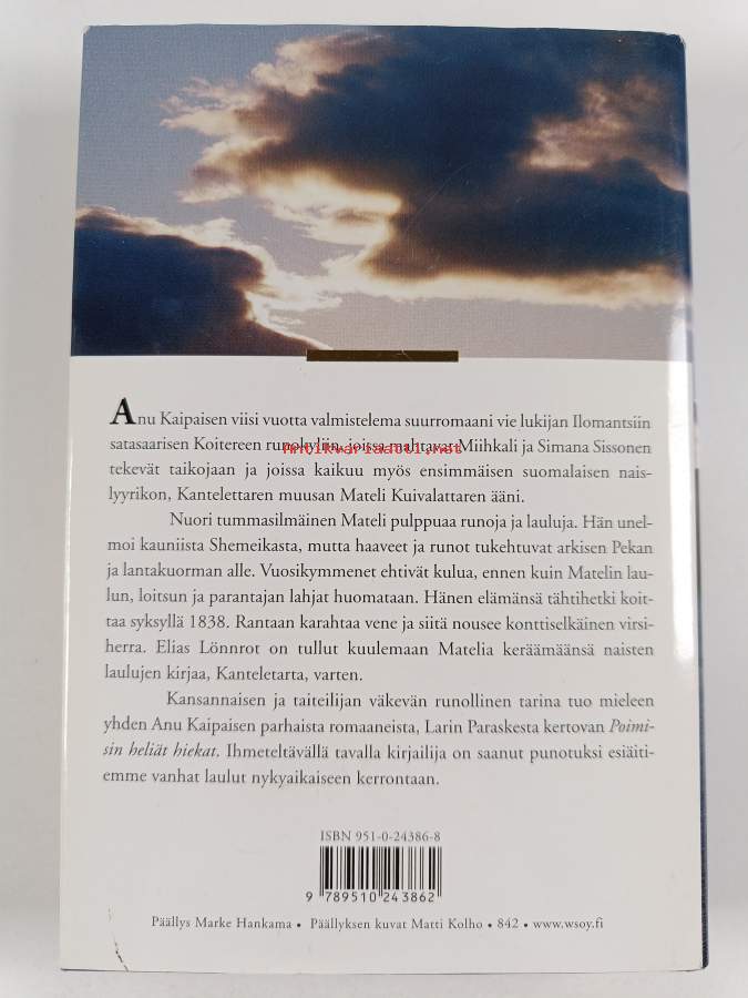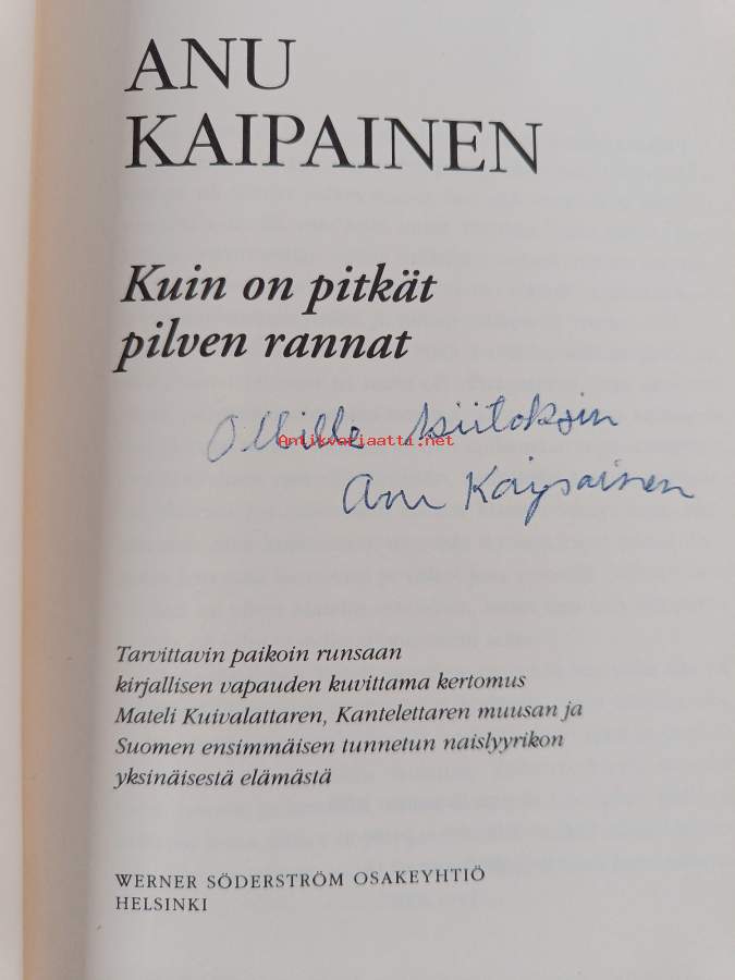 Koko nimi: Kuin on pitkät pilven rannat : tarvittavin paikoin runsaan kirjallisen vapauden kuvittama kertomus Mateli Kuivalattaren, Kantelettaren muusan ja Suomen ensimmäisen tunnetun naislyyrikon yksinäisestä elämästä (signeerattu, tekijän omiste)