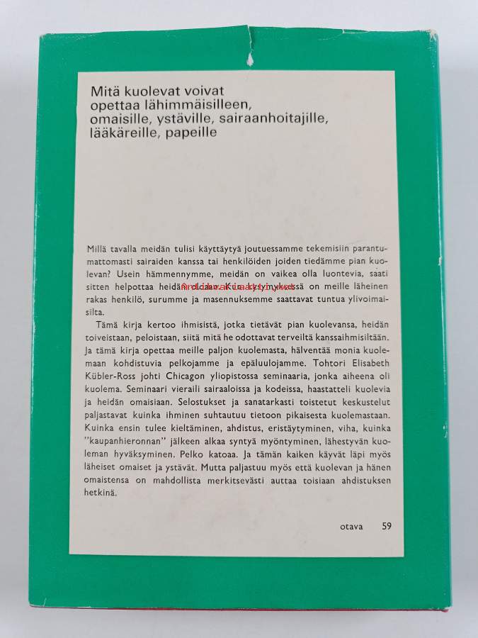 Muu(t) tekijä(t): Annukka AikioMerkinnät: exlibris: Vappu TiitolaAlkuteos: On death and dyingAsiasanat: kuolema, kuolemanpelko, saattohoito
